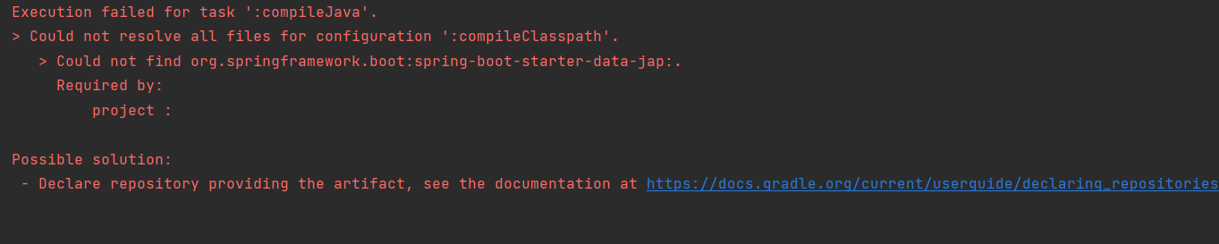 스프링 실행 오류) Execution failed for task ':compileJava'.> Could not resolve all files for configuration ':compileClasspath'. 해결