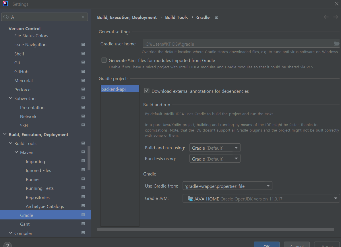 Build,Execution,Deployment > Build Tools > Gradle 을 누른다.