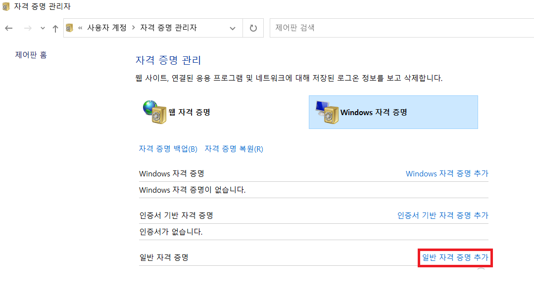 Windows 자격 증명 > 일반 자격 증명을 클릭합니다.