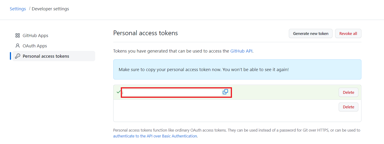 생성된 token은 반드시 저장해두셔야 합니다!! (나중에 다시 확인 어려워요)
