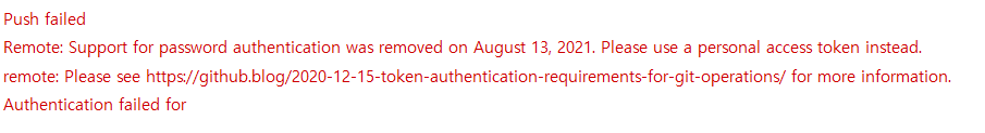 Git 토큰 인증 오류 해결 ) Remote: Support for password authentication was removed on August 13, 2021. Please use a personal access token instead. remote